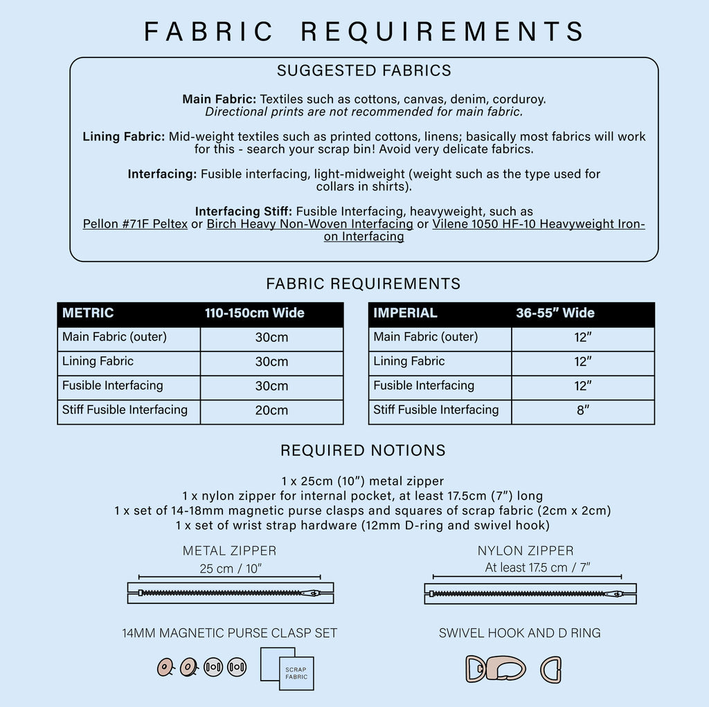 Lining Fabric: Mid-weight textiles such as printed cottons, linens; basically most fabrics will work for this - search your scrap bin! Avoid easily fraying fabrics.